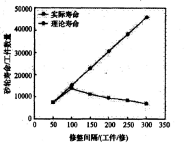 從下圖可以看出,當(dāng)修整間隔為50件,修時(shí),砂輪理論壽命最大值為7 650件,砂輪的實(shí)際壽命為7 480件,砂輪壽命的實(shí)際值和理論值比較接近,說(shuō)明砂輪損耗正常,砂輪的消耗基本都是修整消耗。