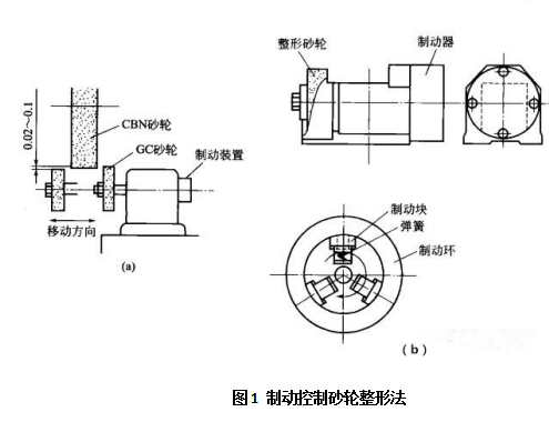 力按壓CBN砂輪時,整形砂輪則隨CBN砂輪一起轉動。另外,整形砂輪還做往復移動,以一定的滾壓力進行修整。在整形砂輪軸上安裝制動器的目的是為了使整形砂輪與CBN砂輪間產生相對速度。圖1(b)所示為制動器示意,制動塊因受彈簧力作用向制動環(huán),依靠摩擦作用降低整形砂輪速度。整形砂輪與CBN砂輪的相對速度越大,整形效率越高。
