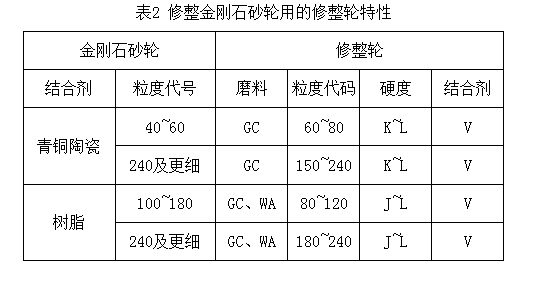 這種方法同時也可以用于修銳,是常用的一種修整方法??捎锰蓟?、剛玉油石修整超硬砂輪,也可用動力驅動金剛石、碳化硅或剛玉砂輪來修整超硬砂輪。修整金剛石砂輪時,修整輪的特性見表2。修整CBN砂輪的修整特性也可參考表2選取,只是其硬度應取得略低一些。